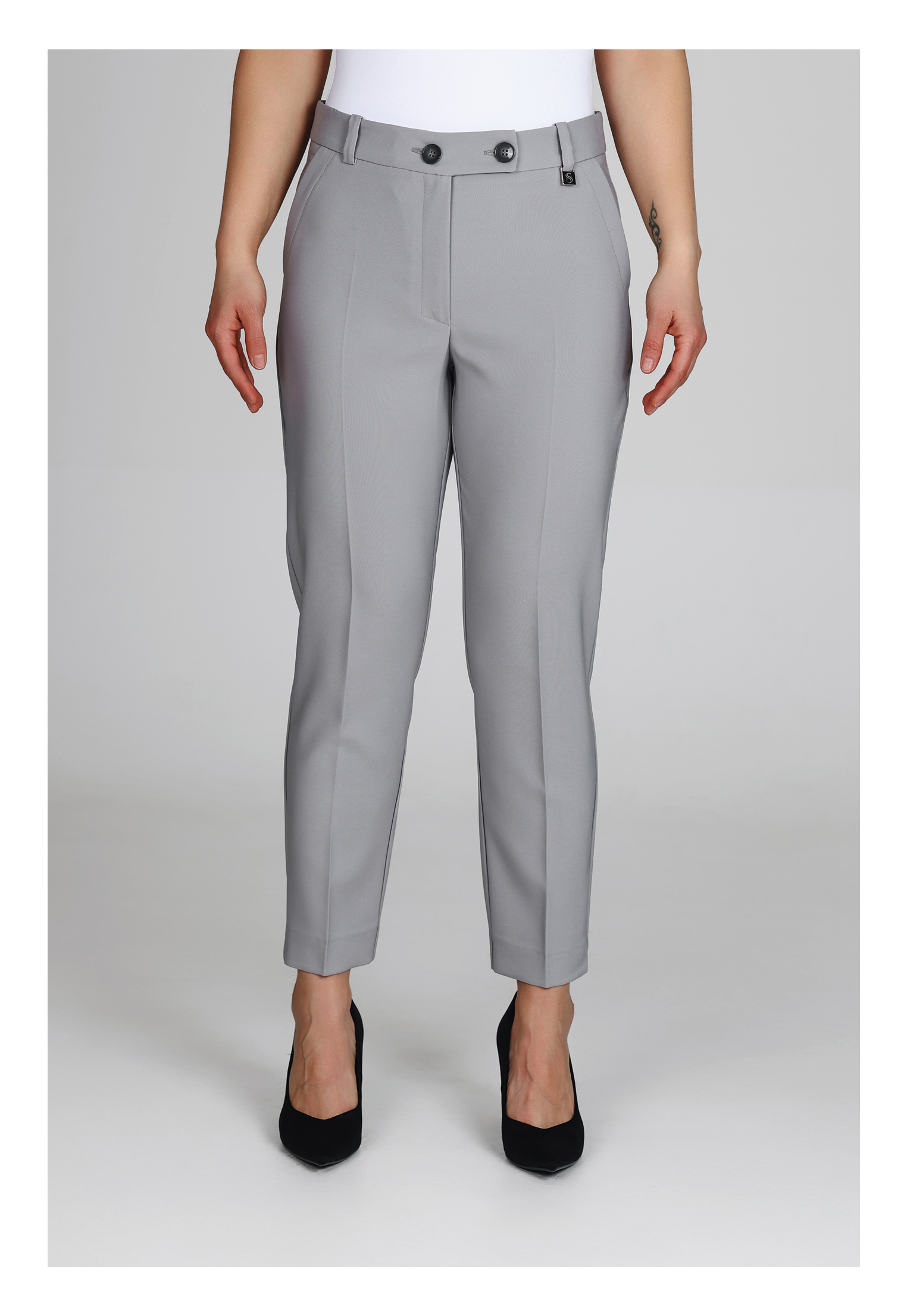 Fedezd fel a modern eleganciát ezzel az egyenes szabású, enyhén szűkülő, boka felett végződő nadrággal! Ez az oldalzsebes, hátul paszpólos zsebbel, derékrésznél gombolópánttal kialakított nadrág élvasalással rendelkezik. A nadrágszár hajtásán enyhe sliccelés.