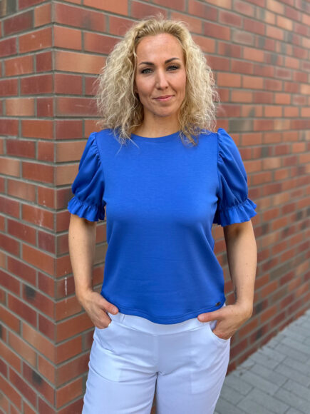 Kényelem és nőiesség: a könnyed szabásvonal kényelmes mozgást biztosít, miközben a buggyos ujjak és fodros részletek garantálják a stílusos megjelenést.
