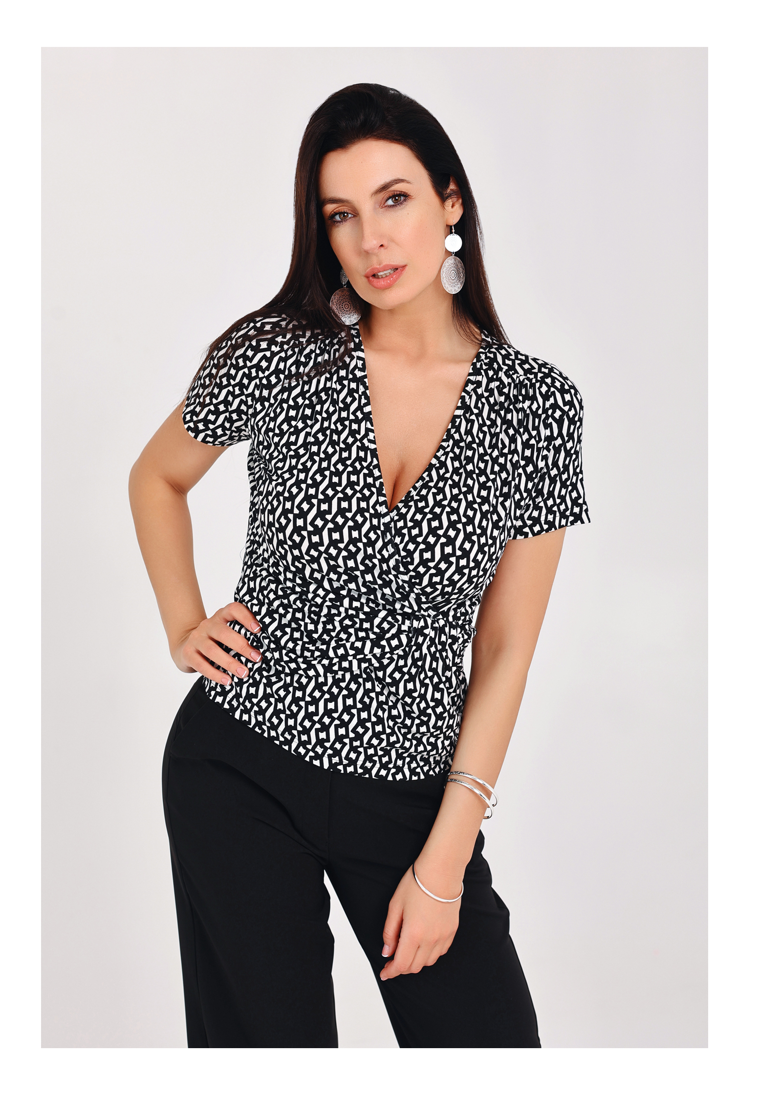 Viszkózból készült, rövid ujjú, átlapolt, fekete-fehér mintás felső kreatív részletmegoldásokkal: függőlegesen enyhén ráncolt váll alatti rész, derékrészen finoman ráncolt részletek és anyagcsavarás. Ez a rendkívül feminin felső egyszerre tükrözi a kreatív, a stílusosan érzéki, és az elegáns nőt.