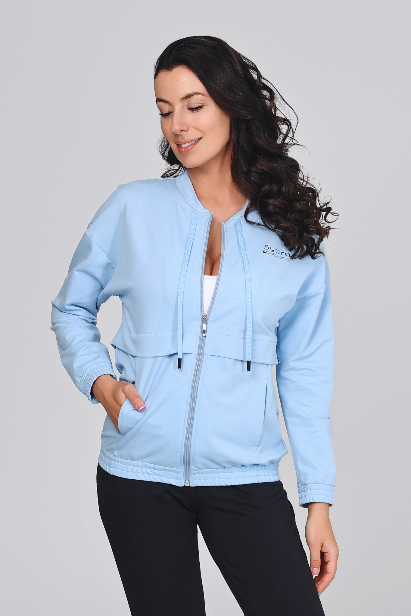 Sportosan nőies megjelenés: az ejtett vállak laza hatást keltenek, míg az egyenes zsebek és a visszafogott márkajelzés letisztult stílust biztosítanak.